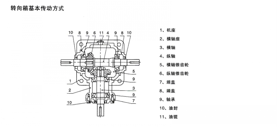T系列齒輪轉向箱,轉向齒輪箱的構成部分主要有機座、橫軸座、橫軸、縱軸、橫軸錐齒輪、縱軸錐齒輪、端蓋、軸承、油封、油鏡等(見下圖)。